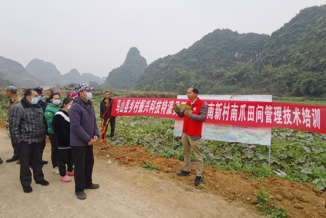 廣西大學農(nóng)學院科技特派員唐小付在南寧市馬山縣百龍灘鎮(zhèn)開展南瓜越冬栽培管理和病蟲害防治技術(shù)培訓。(央廣網(wǎng)發(fā) 廣西科技廳供圖)