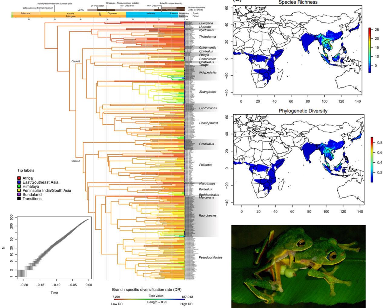 該研究使用最新的數據分析方法,對東半球樹蛙科415個物種現有的全部基因組和多基因序列數據進行分類歸并,構建生成了迄今為止最為全面的系統發育樹。結果表明,在東半球樹蛙科整個系統發育過程中,物種分化速率幾乎是恒定的,但物種豐富度的分布卻很不均勻、在演化過程中有明顯聚集現象。其中,島嶼上的高海拔地區和一些具有陰冷潮濕氣候的大陸地區呈現較高的物種多樣性和獨特的分類群。