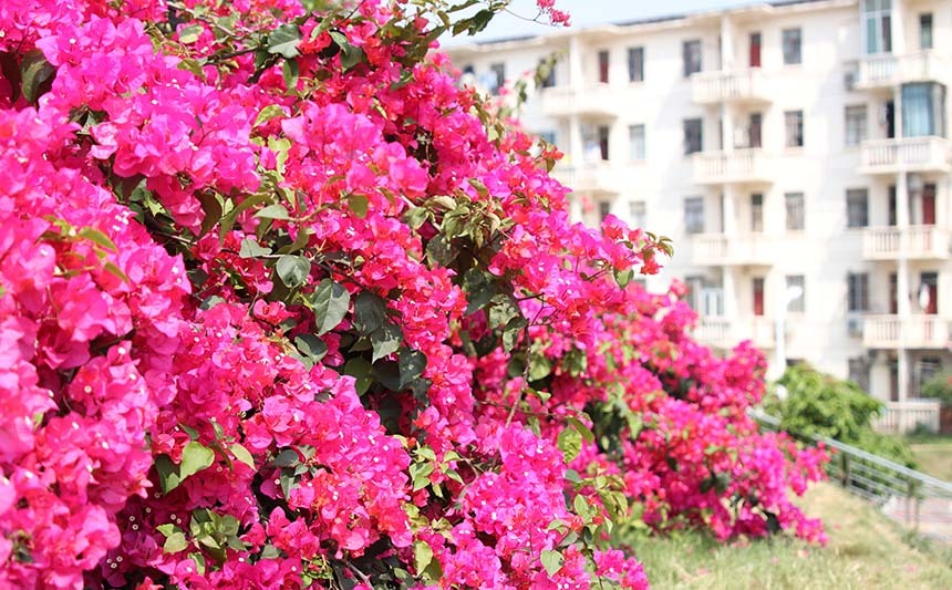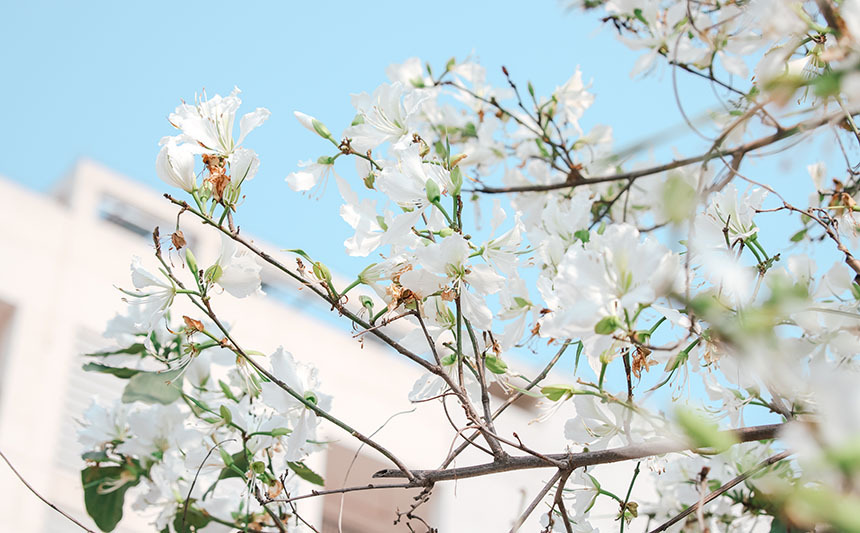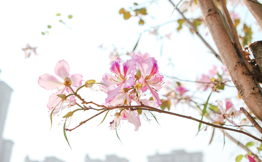 近日,廣西大學(xué)迎來花期。洋紫荊、三角梅、朱瑾等花朵相繼綻放,點(diǎn)綴了校園的春天,共同構(gòu)成了一道秀麗的風(fēng)景線,不時(shí)引來行人駐足觀賞,拍照留念。圖為藍(lán)天下的白洋紫荊。