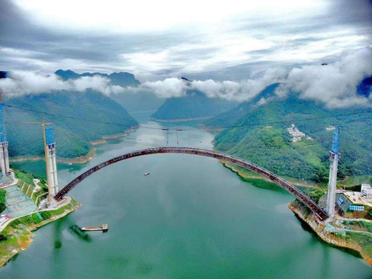 天峨龍灘特大橋位于廣西河池市天峨縣龍灘水庫,是南丹至天峨下老高速公路控制性工程、西部陸海新通道高速公路上的一座上承式勁性骨架混凝土拱橋。天峨縣是廣西最后三個沒有通高速的縣域之一,目前正在修建的南丹至天峨下老高速公路將改變這一局面。而天峨龍灘特大橋是這條高速公路上的一個重點控制性工程,大橋全長2488.55米。其中,主橋采用上承式勁性骨架混凝土拱橋方案,跨徑600米,建成后將成為世界最大跨徑拱橋,把混凝土拱橋跨徑的世界紀錄提高了155米。該橋跨度大,設計、施工難度極高,將成為拱橋建造史上的又一里程碑,同時對于國家戰略“一帶一路”南向東盟、川藏鐵路、西部陸海新通道沿線橋梁工程的建設具有引領性的示范作用。