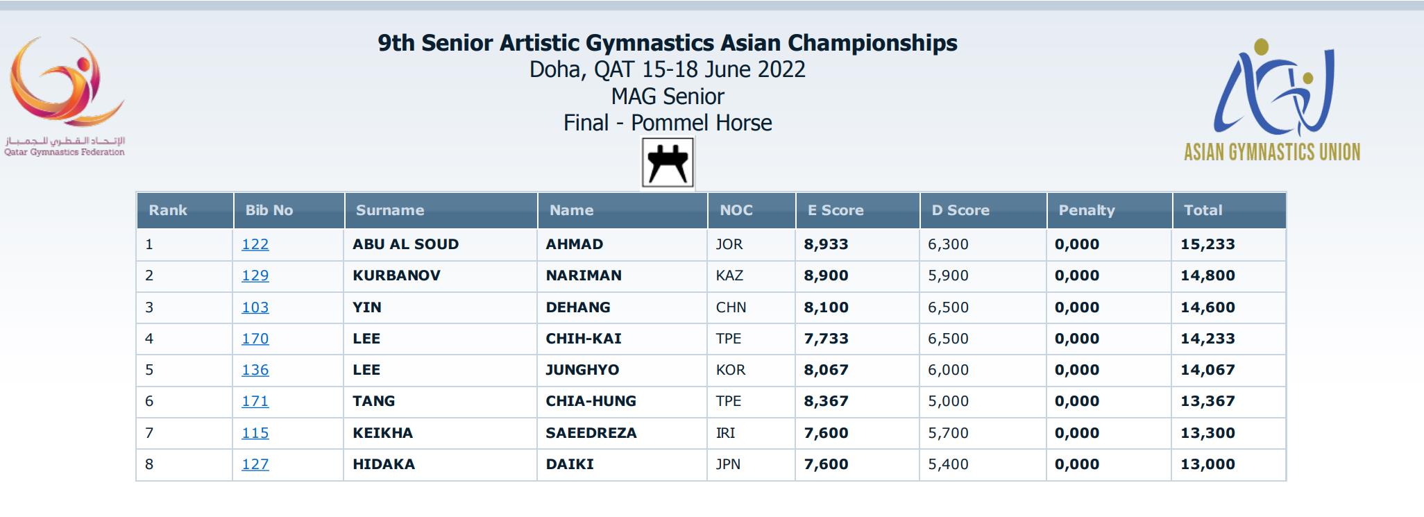 此外,楊家興在男子自由操決賽中得到與韓國選手金韓松相同的14.333分,因完成分稍低排在韓國選手之后,收獲一枚銅牌。尹德行在男子鞍馬決賽中得到14.600分,同樣收獲一枚銅牌。