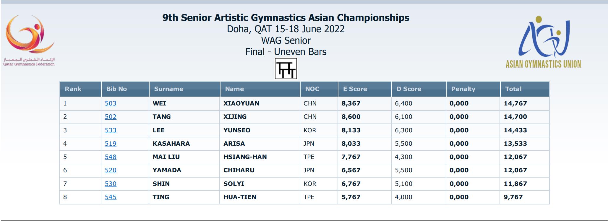 女子高低杠決賽,兩位中國姑娘韋筱圓和唐茜靖發揮出色,分別得到14.767分和14.700分,包攬該項目冠亞軍。