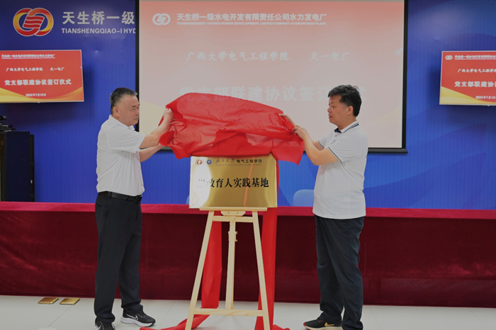 在天一電廠,廣西大學電氣工程學院黨委書記梁志堅與天一電廠黨委書記周金相共同為“電氣工程學院思政育人實踐基地”揭牌。隨后進行了黨支部聯建簽約儀式,雙方將在黨建工作框架下開展人才培養、科研合作、實習實踐、文化建設等活動,促進基層黨建工作特色化、制度化。