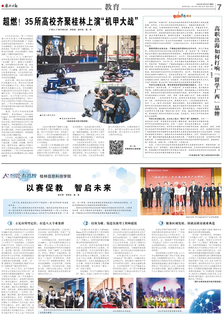 3月21日至23日,第二十四屆全國大學生機器人大賽RoboMaster 2025機甲大師高校聯盟賽(廣西站)在桂林信息科技學院舉行。在為期3天的賽程里,35支高校隊伍的1000多名高校“機甲大師”閃耀登場,開展3V3對抗賽、步兵對抗賽和工程挑戰賽三大賽項的激烈角逐。