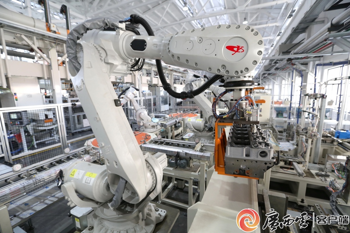 在玉柴“黑燈工廠”國六智能化生產線上,機器人正在作業。廣西玉柴機器集團有限公司供圖