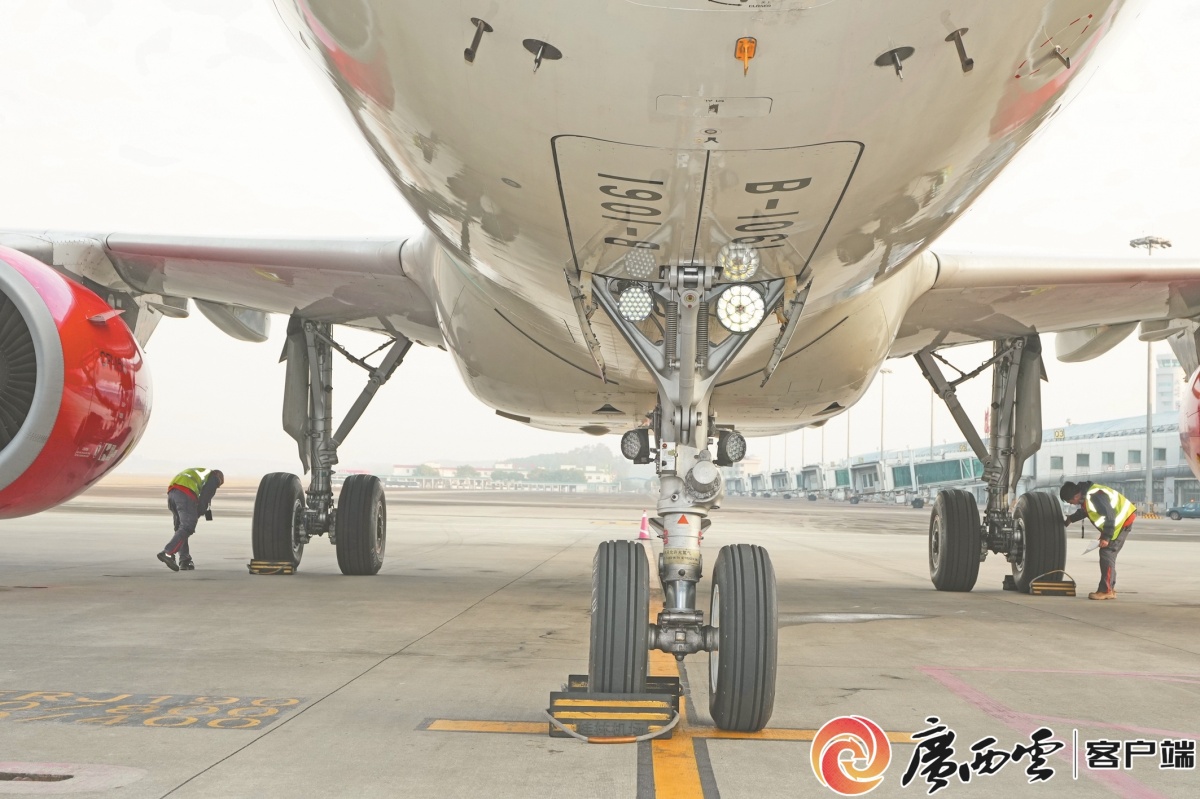 由桂林藍宇航空輪胎發展有限公司自主研制的中國首條民用航空子午線輪胎裝配空客A320飛機,并在桂林兩江機場試飛成功,實現了我國民用航空子午線輪胎零的突破。何平江 攝