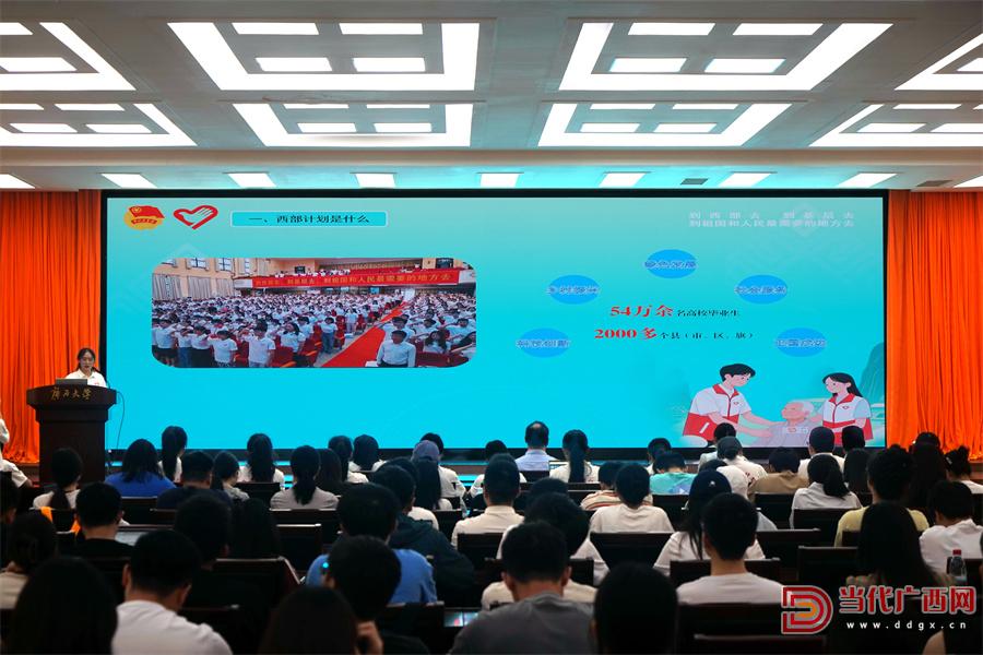 宣講會(huì)上,西部計(jì)劃廣西項(xiàng)目辦圍繞西部計(jì)劃是什么、為什么選擇西部計(jì)劃、如何報(bào)名西部計(jì)劃、參加西部計(jì)劃可享受哪些政策保障等方面進(jìn)行政策解讀。黃艷琴、羅智文、羅海芳、許敏等4名優(yōu)秀西部計(jì)劃志愿者代表分別結(jié)合服務(wù)崗位,分享了參與西部計(jì)劃的心路歷程、實(shí)踐故事和成長收獲,并向大家發(fā)出“赴西部之約”的邀請(qǐng)。