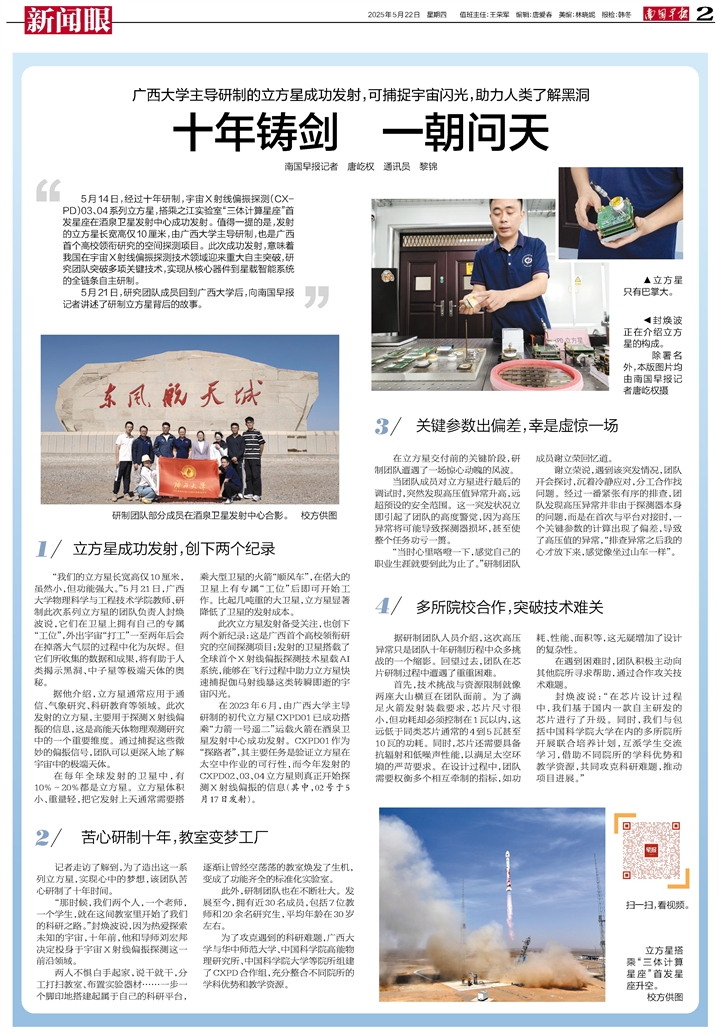 5月14日,經過十年研制,宇宙X射線偏振探測(CXPD)03、04系列立方星,搭乘之江實驗室“三體計算星座”首發星座在酒泉衛星發射中心成功發射。值得一提的是,發射的立方星長寬高僅10厘米,由廣西大學主導研制,也是廣西首個高校領銜研究的空間探測項目。此次成功發射,意味著我國在宇宙X射線偏振探測技術領域迎來重大自主突破,研究團隊突破多項關鍵技術,實現從核心器件到星載智能系統的全鏈條自主研制。
