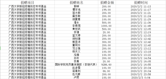 自廣西大學校友總會與教育發(fā)展基金會發(fā)布捐贈公告以來,截至2020年2月2日晚上7點,基金會共接受捐贈19筆,具體明細如下: