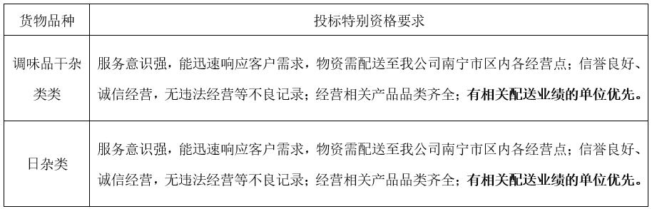 3.2具有生產、加工或銷售的相關資質,生產、加工企業必須具備所投標產品的《食品生產許可證》(初級農產品除外),銷售商必須具備所投標產品的《食品經營許可證》或經食品監督部門備案的《僅銷售預包裝食品經營者備案信息采集表》。
