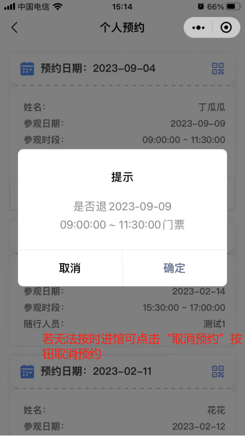9. 若無法按時進館可點擊“取消預約”按鈕取消預約,參觀時段未開始前都可取消預約,若一個月內預約超過三次未進館的,則會被系統拉入黑名單,半年內不可預約參觀。
