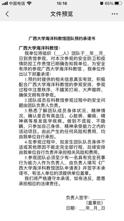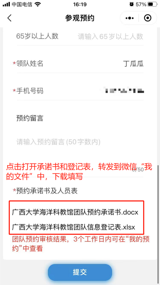 5. 預約申請提交后,可先準備團隊預約承諾書和人員登記表,點擊“廣西大學海洋科教館團隊預約承諾書”或“廣西大學海洋科教館團隊信息登記表”,轉發至微信對話框中(推薦“文件傳輸助手”),下載后按要求填寫預約承諾書和人員登記表內容,填寫完成后發送給館內工作人員,由工作人員審核。