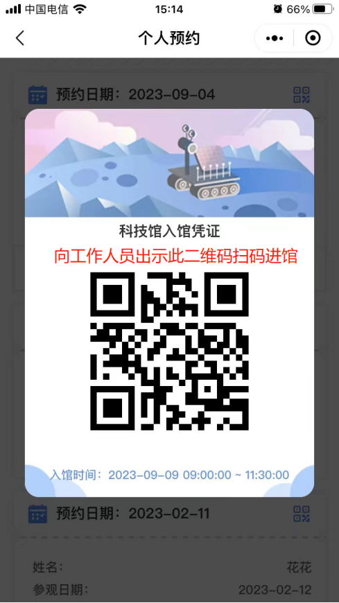 7. 提交預約信息,點擊確定按鈕,預約成功,生成預約二維碼,入館時需向館內工作人員出示預約二維碼,掃碼進館。