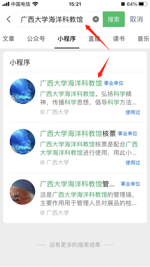 1. 微信搜索“廣西大學海洋科教館”小程序,點擊進入或掃二維碼。
