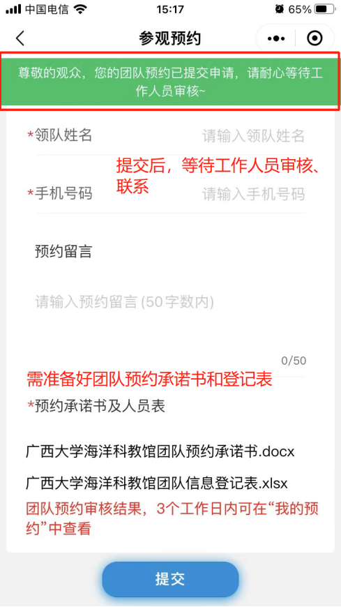 4. 預約信息填寫完成后可提交,提交成功后,等待館內工作人員聯系審核。